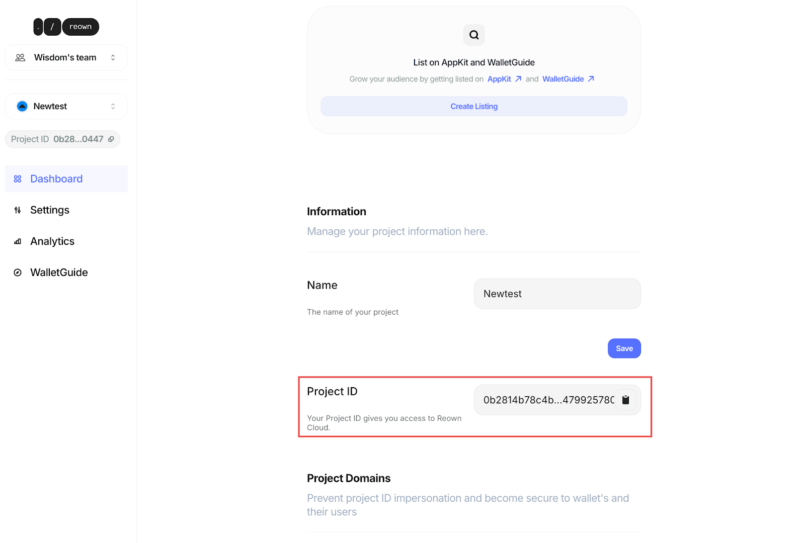- Copy the Project ID provided by WalletConnect.